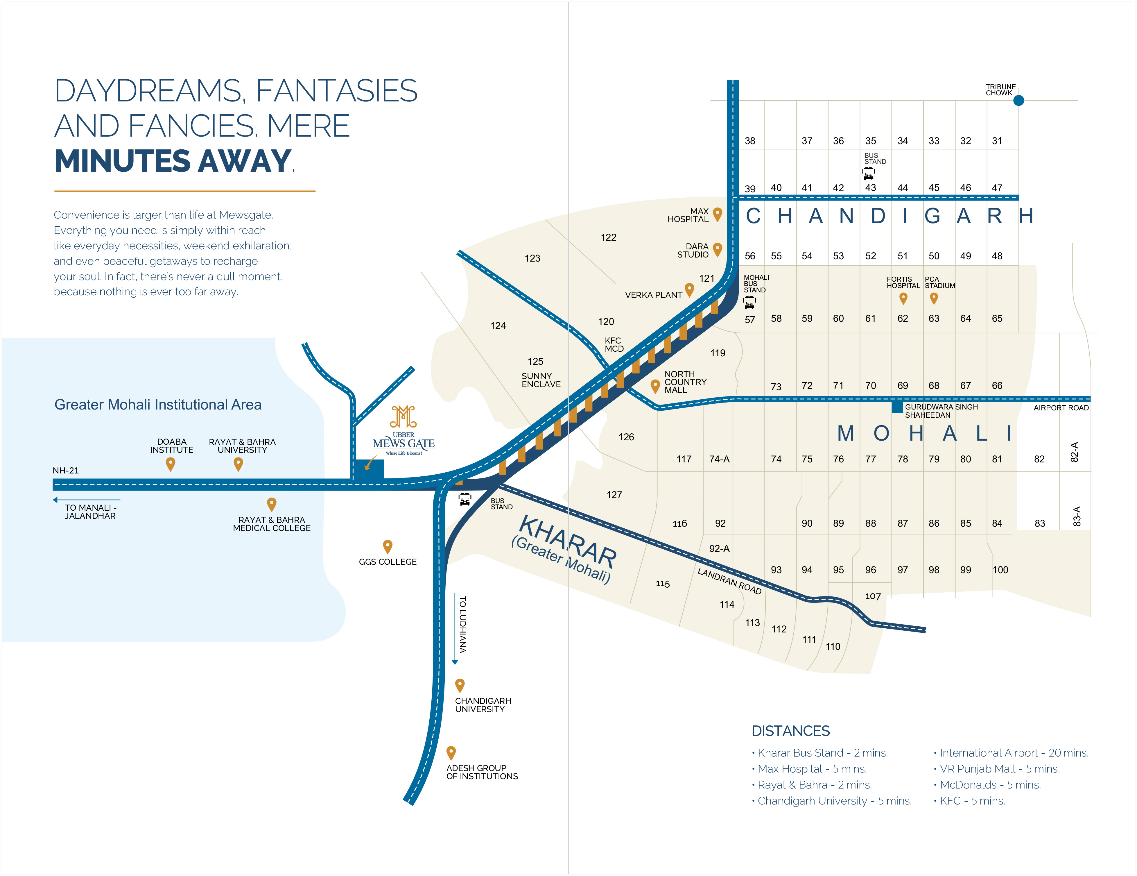 Ubber Mews Gate, located on NH 21, Kharar - Kurali Road in Mohali, enjoys an enviable location that is well-connected to the neighbouring cities and towns. The project is just 5 minutes away from the Chandigarh border, making it easily accessible for those commuting to and from the city.